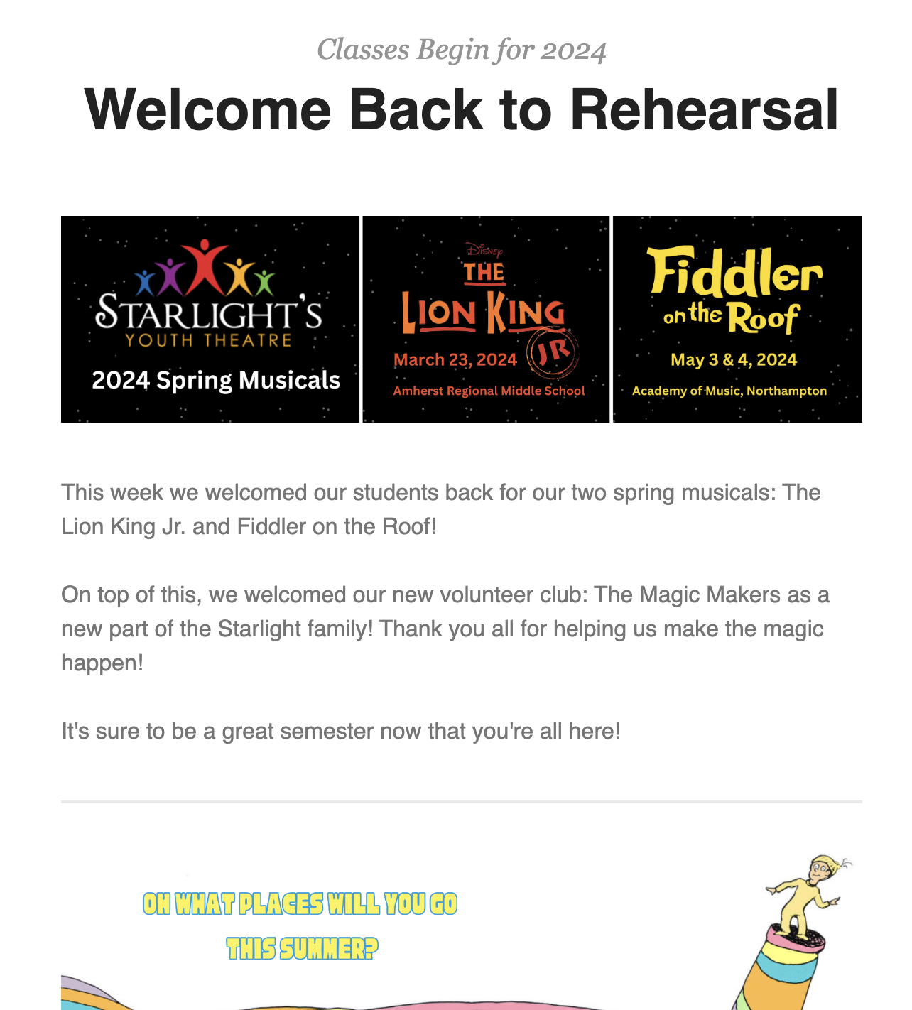 Starlight's Youth Theatre 2025 Annual Board meeting will take place Saturday, October 18th at 1 PM at